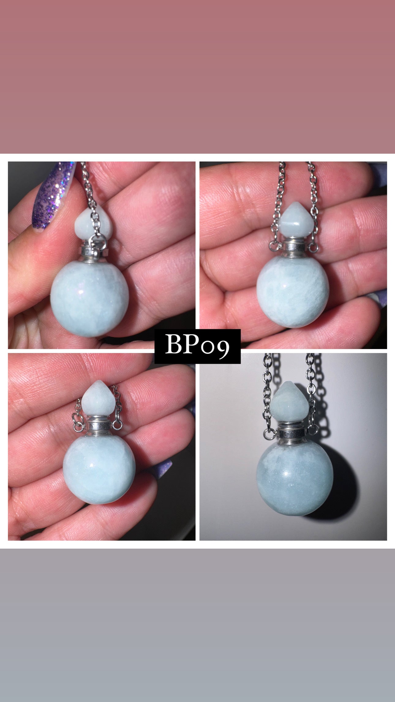 1- Aquamarine bottle pendant on 20-22 inch semi adjustable sterling silver chain with lobster clasp