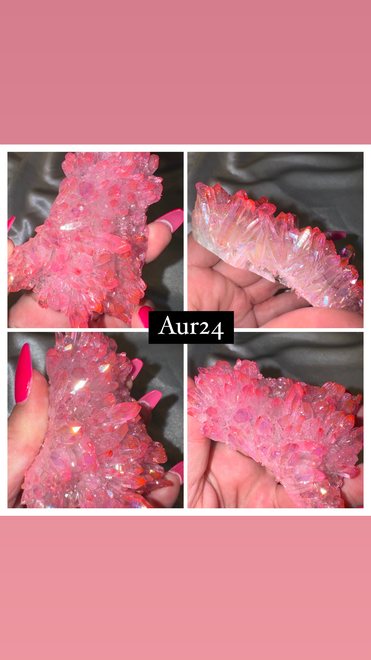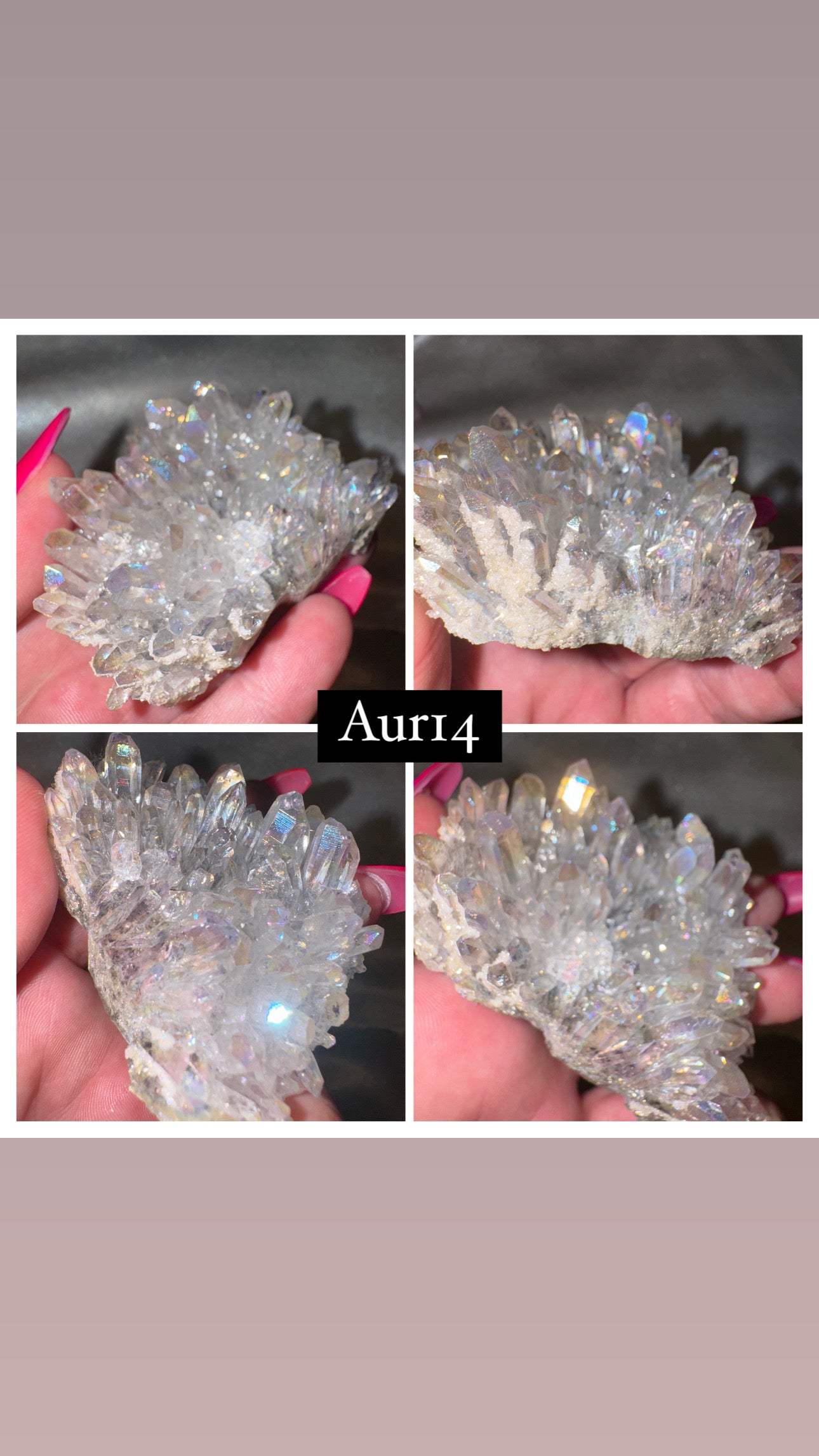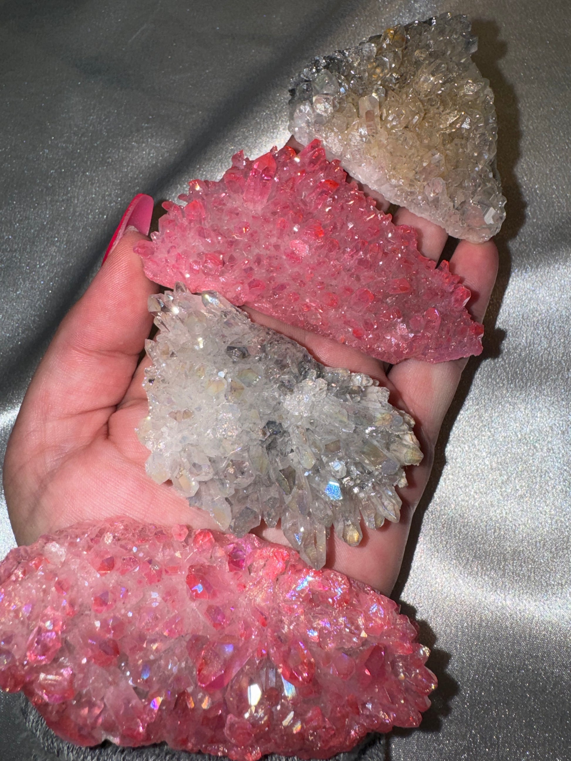*Please note that while the stone are natural crystal, they are “aura” coated. “Aura” is a coating of metals which have been vapor deposited on the crystal at a high temperature in a vacuum chamber by electrostatic charge. Some metals know to be used are: gold, silver, platinum, and titanium.