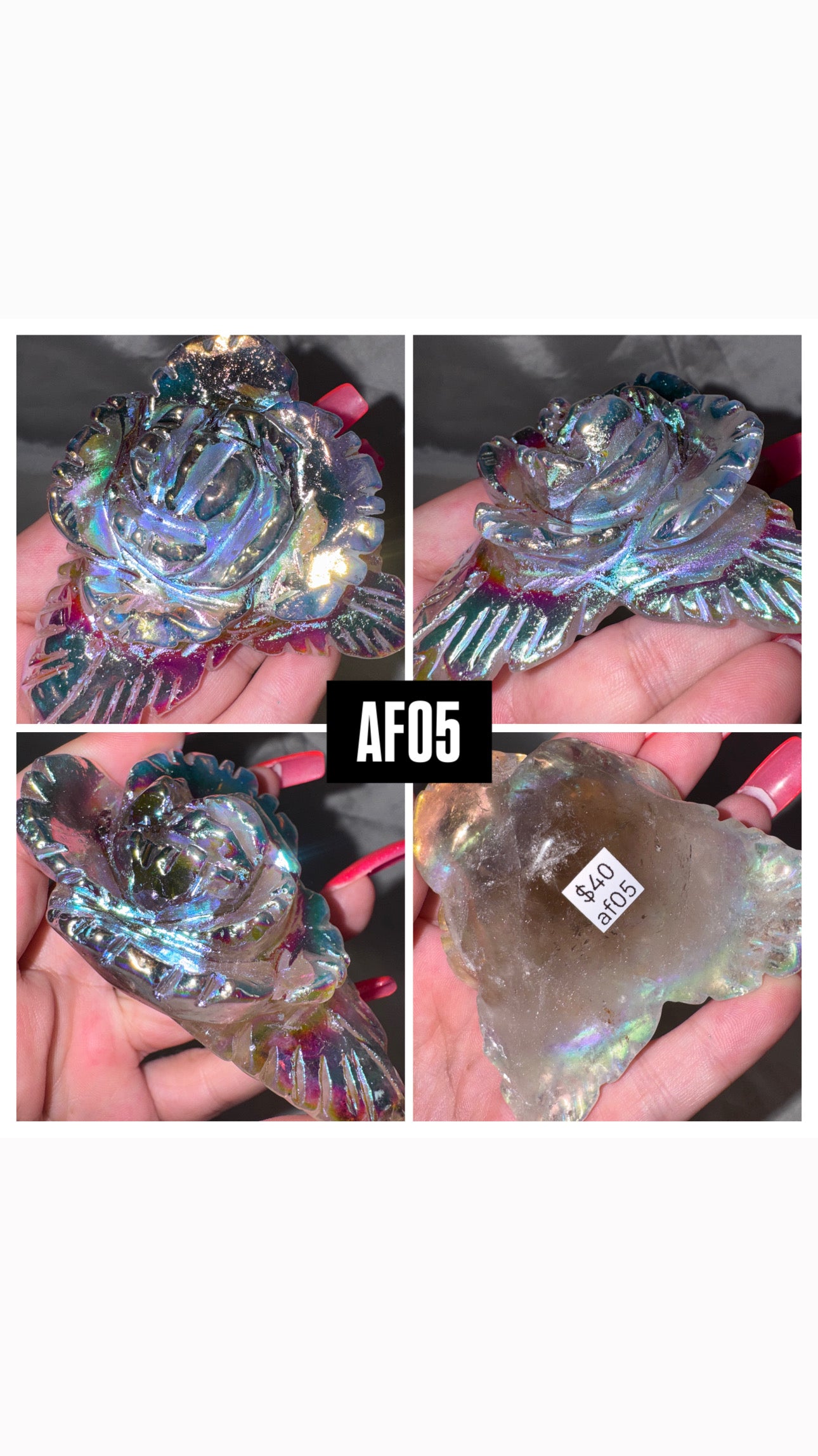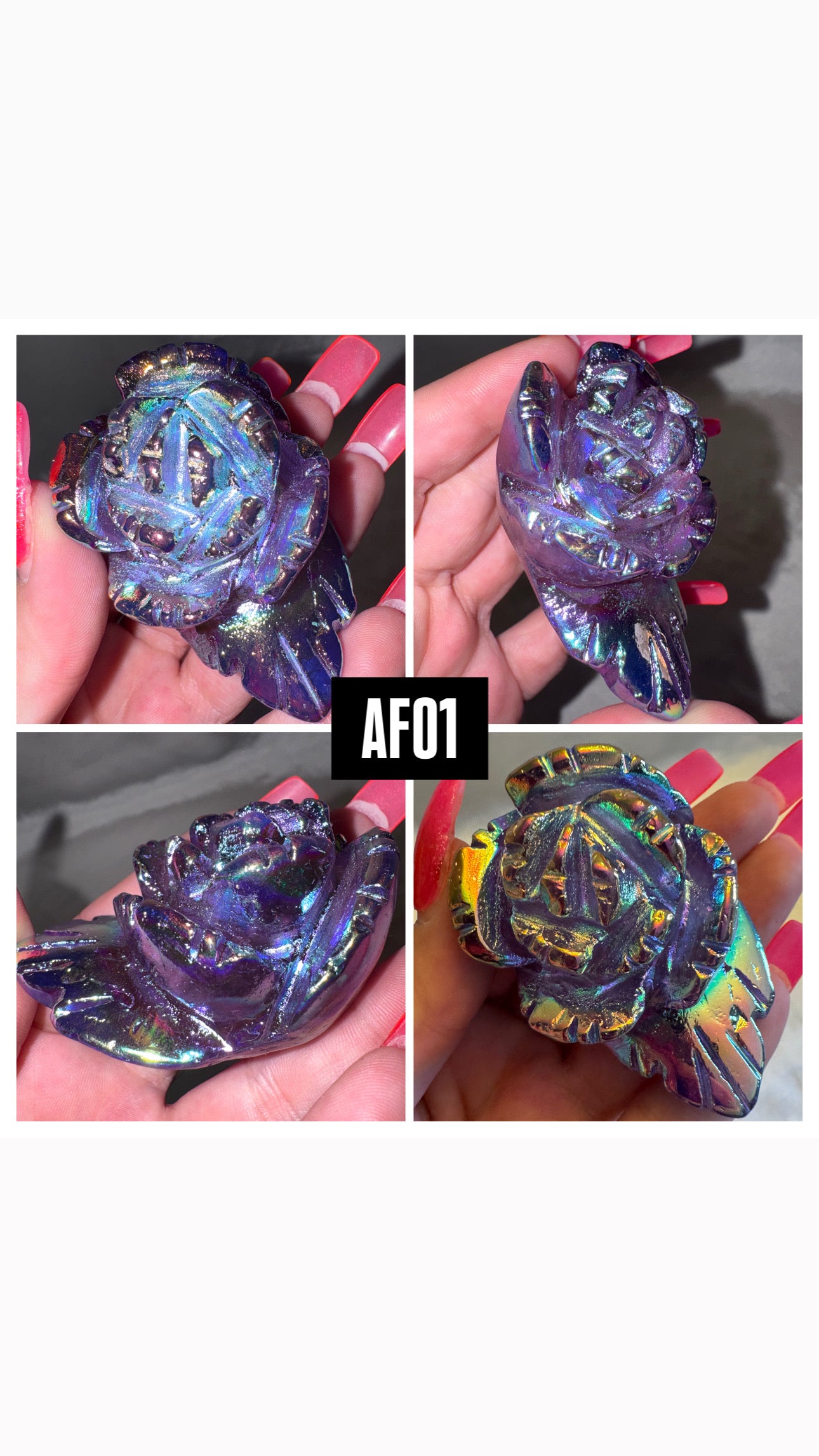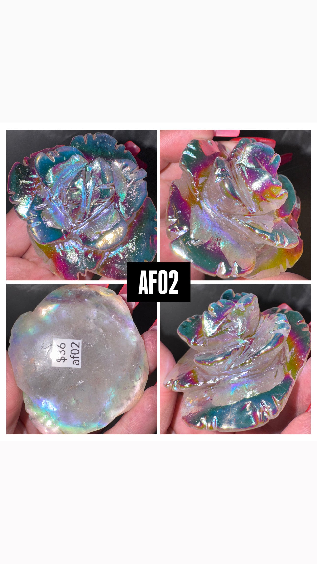 1- Large High quality Aura coated flower carving (most clear quartz, a few are smoky)