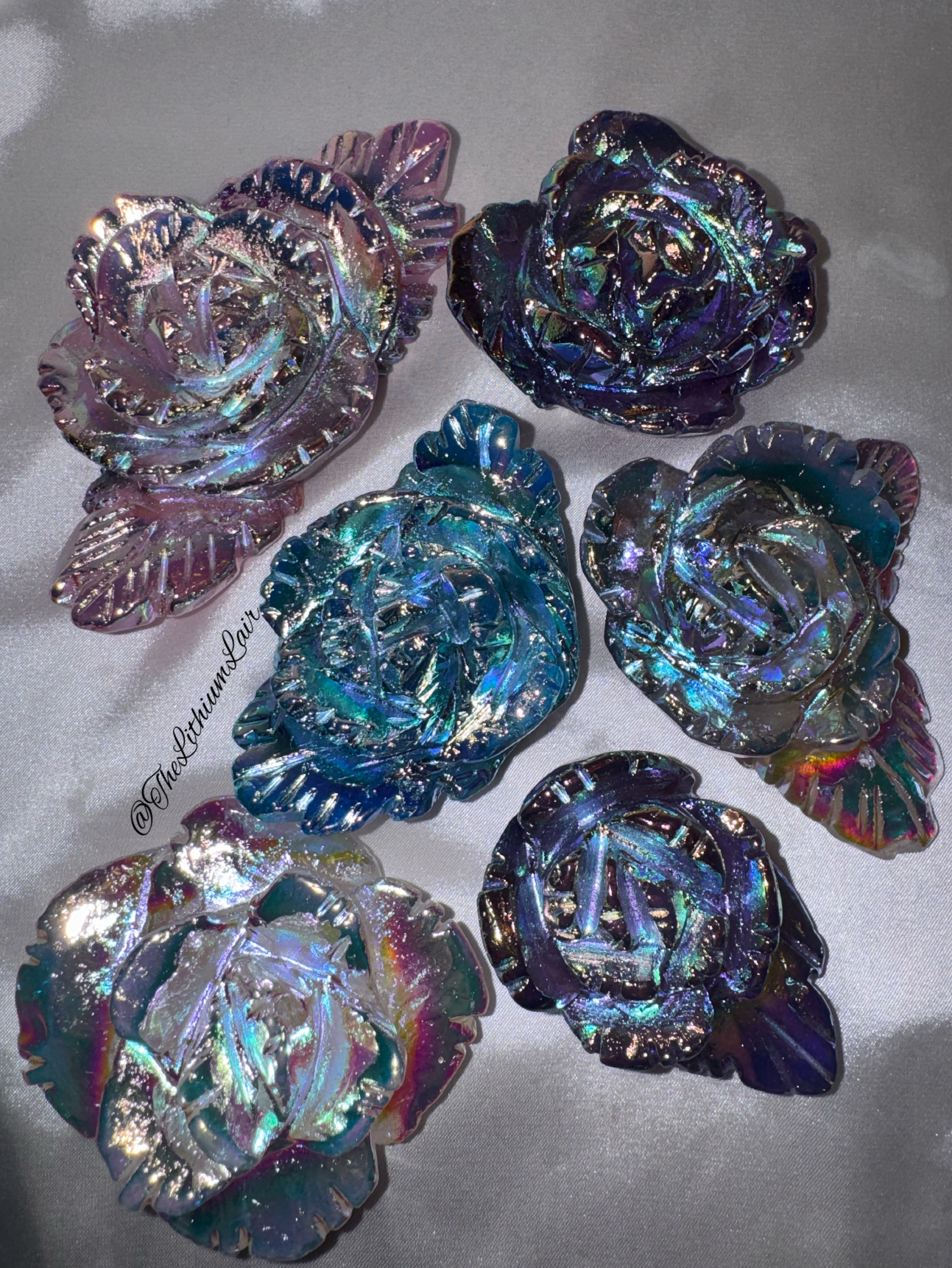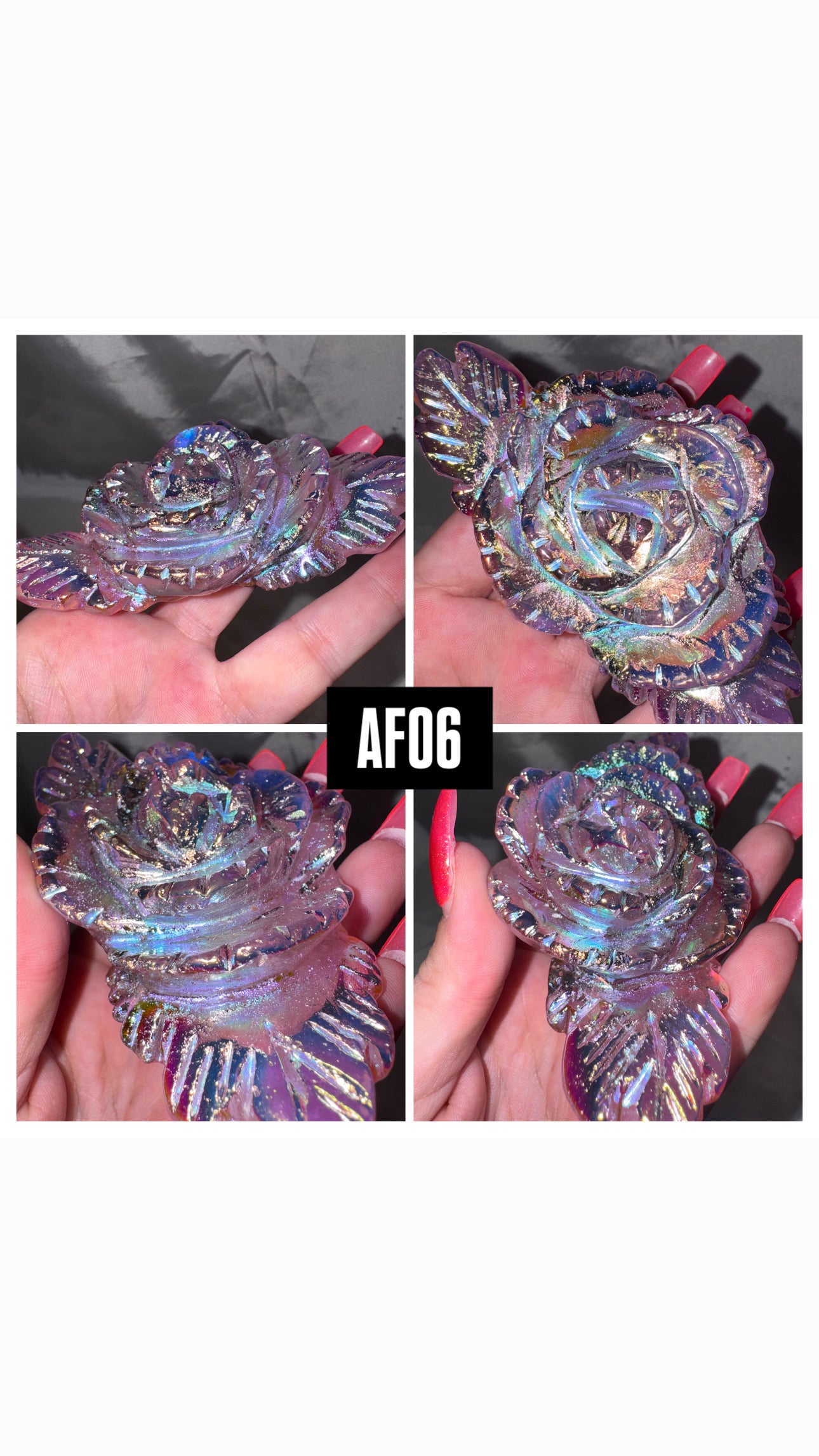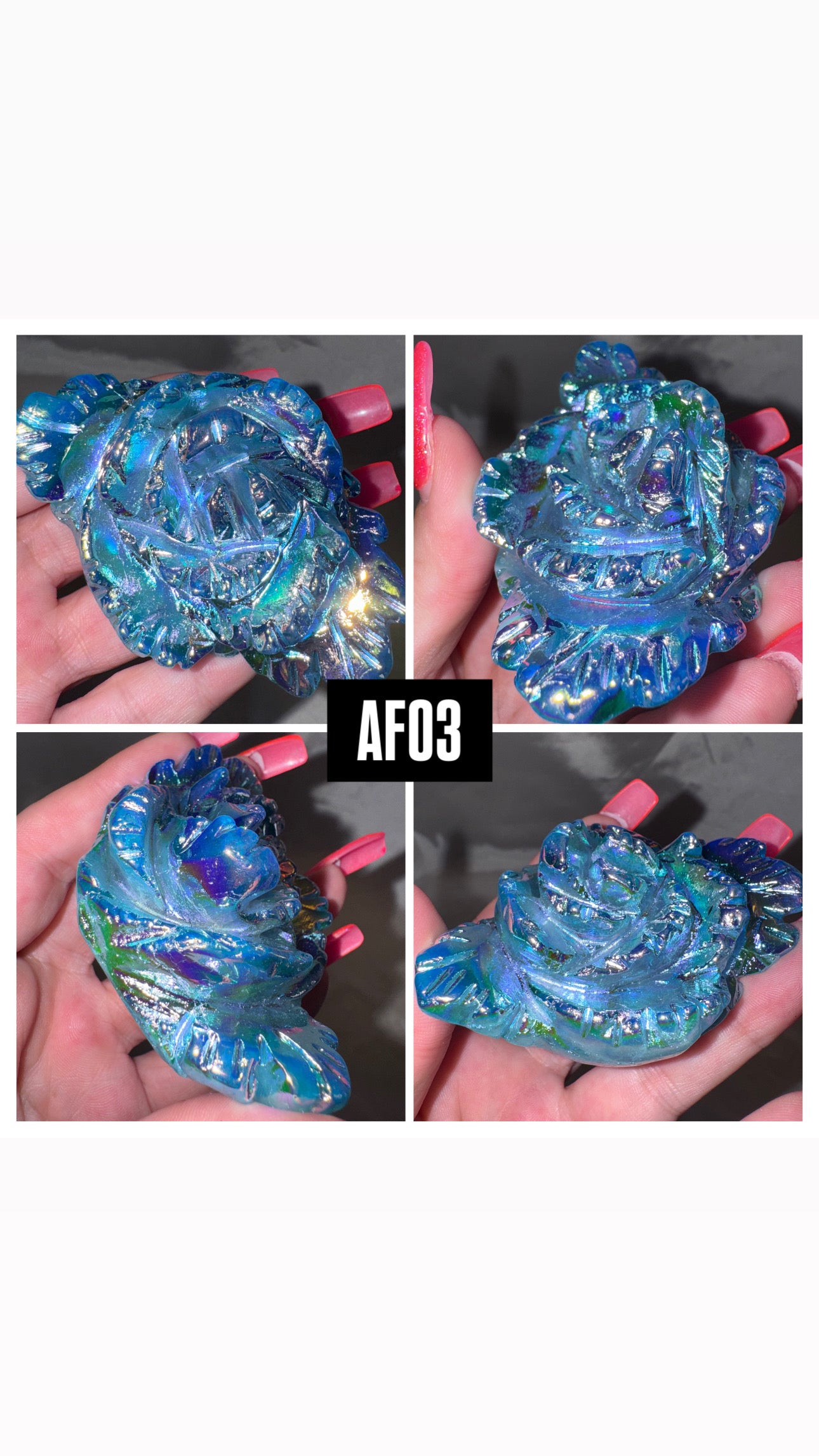 1- Large High quality Aura coated flower carving (most clear quartz, a few are smoky)