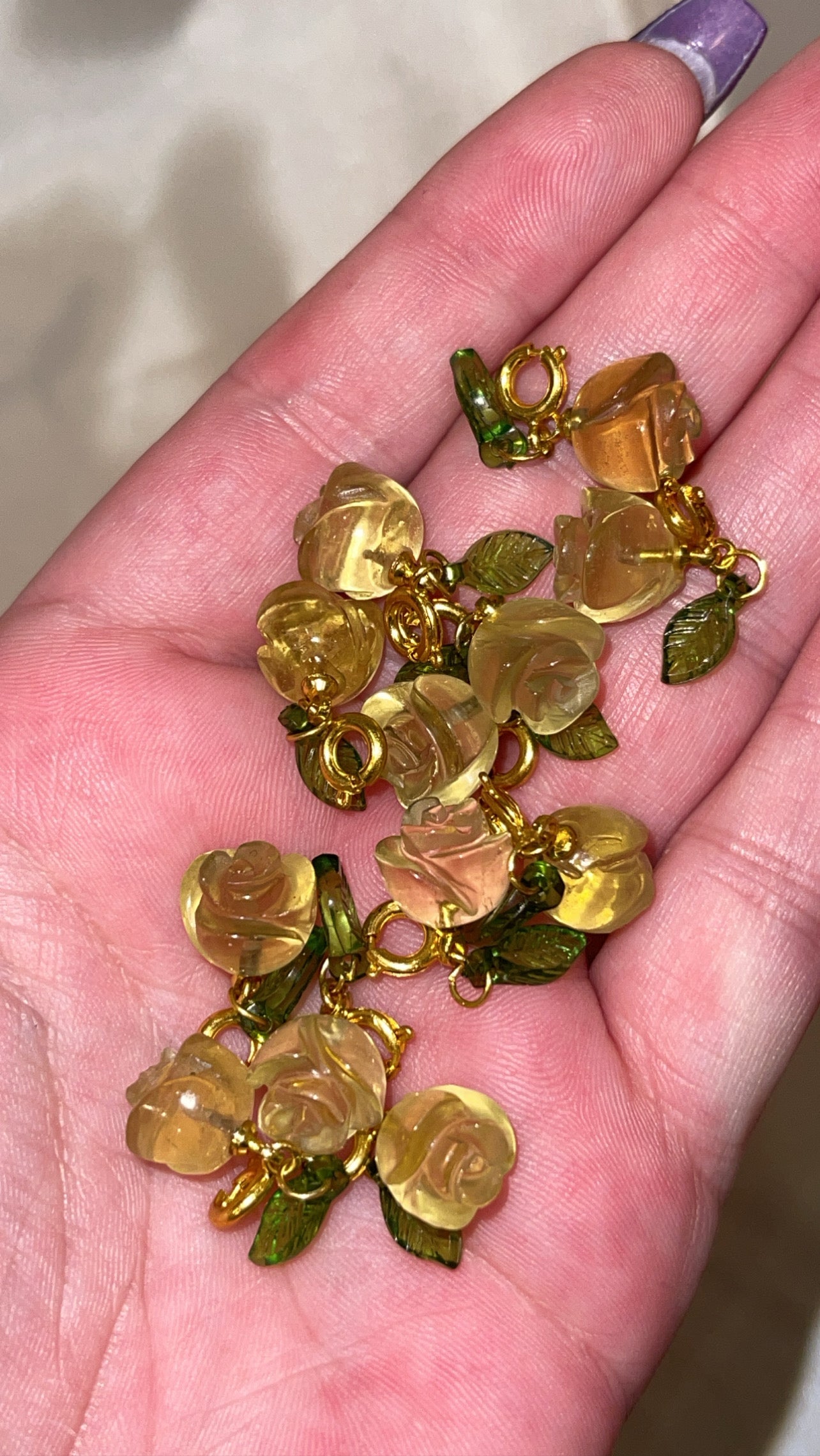 Charm to clip on your bracelet, necklace, keychain, zipper, purse, and so many other places. Flowers are made out of Natural citrine. Green leaf is made of glass. Gold plated.