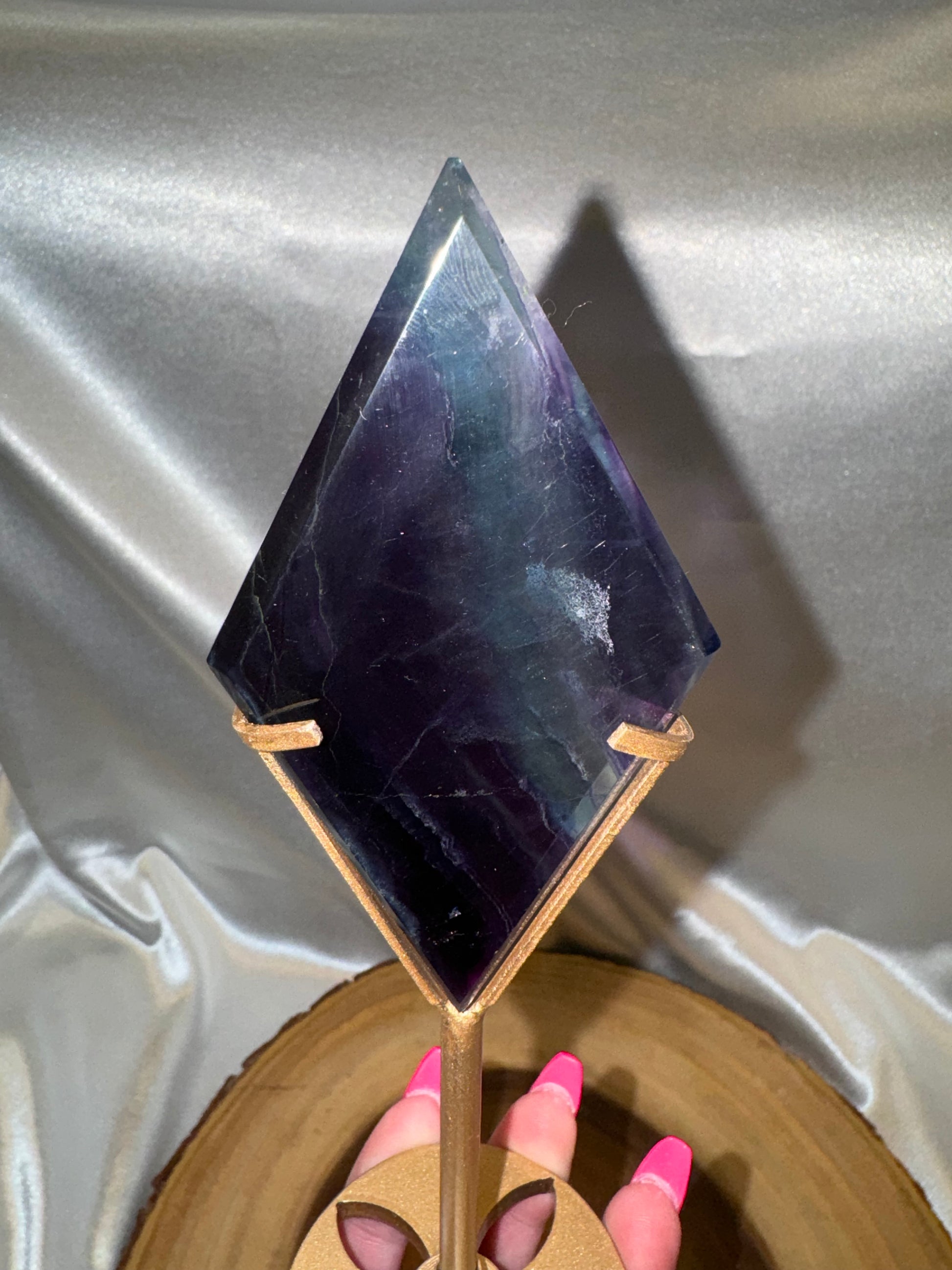 Approximately 7 ounces with stand and 4 ounces without stand. On stand 7.5 inches tall. Fluorite diamond itself is 4.5 inches by 2.5 inches.