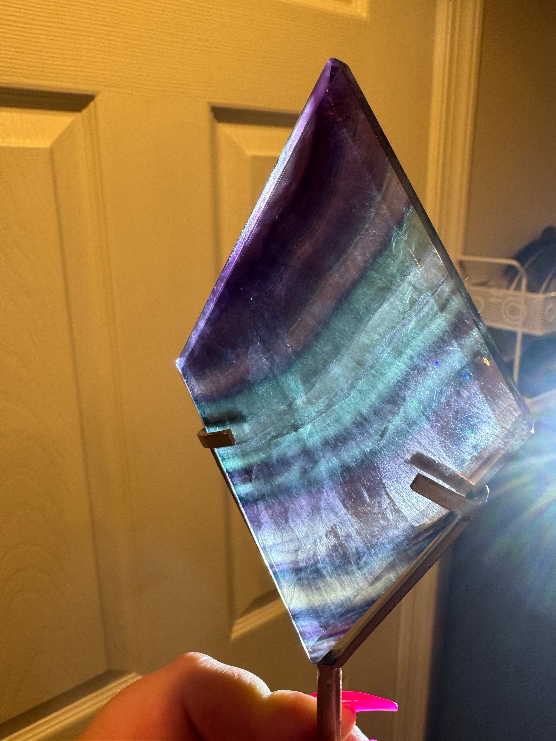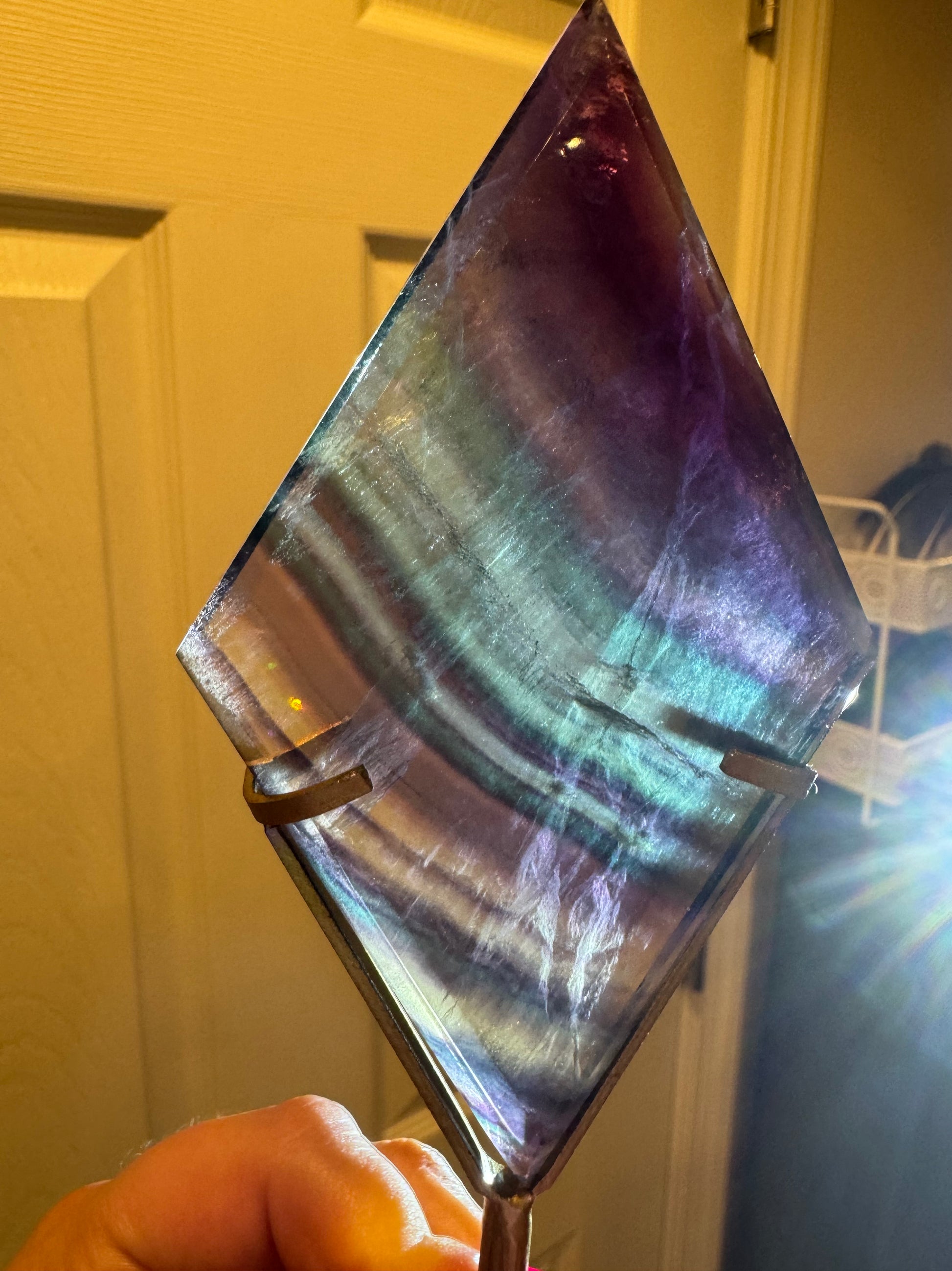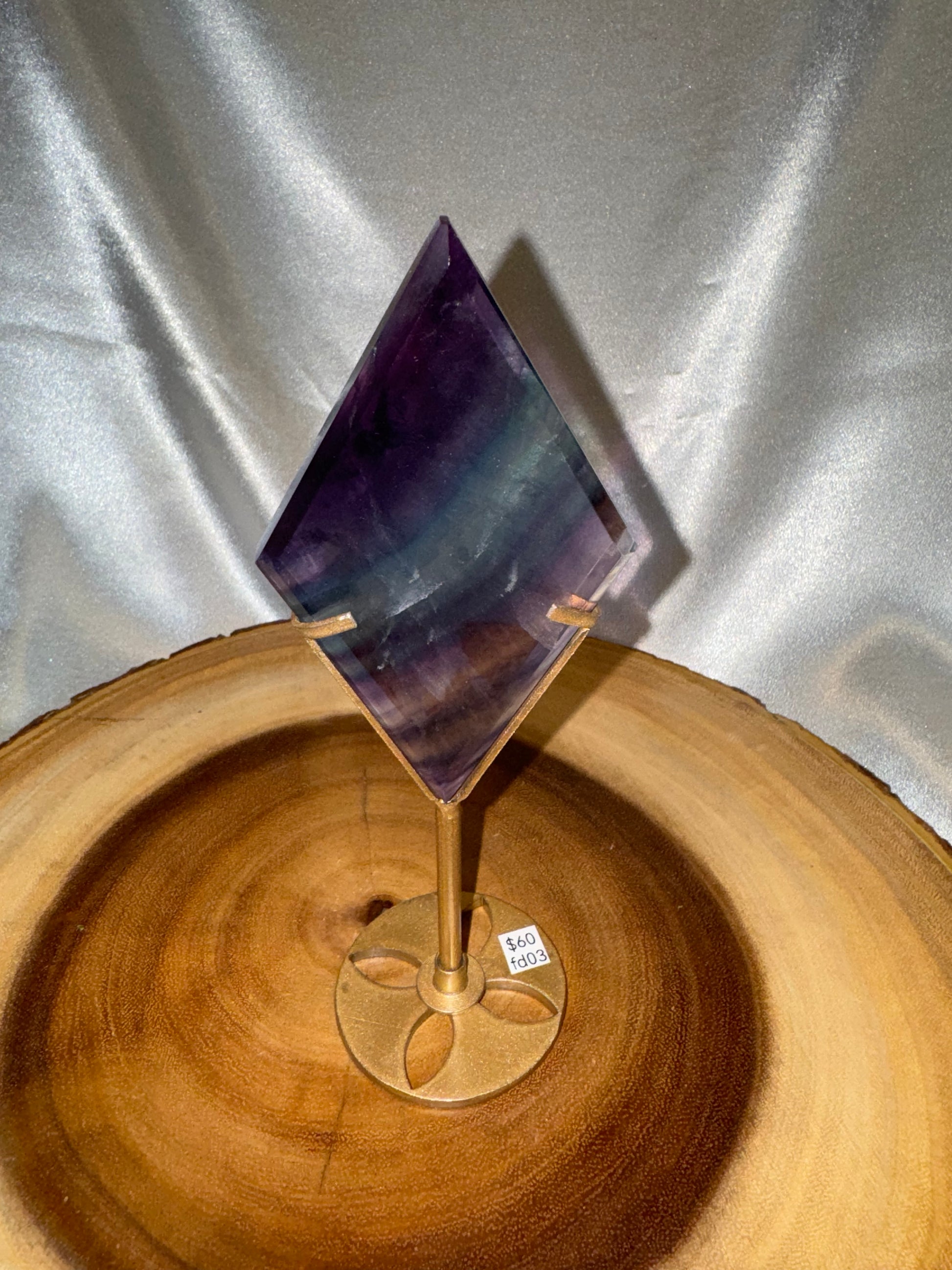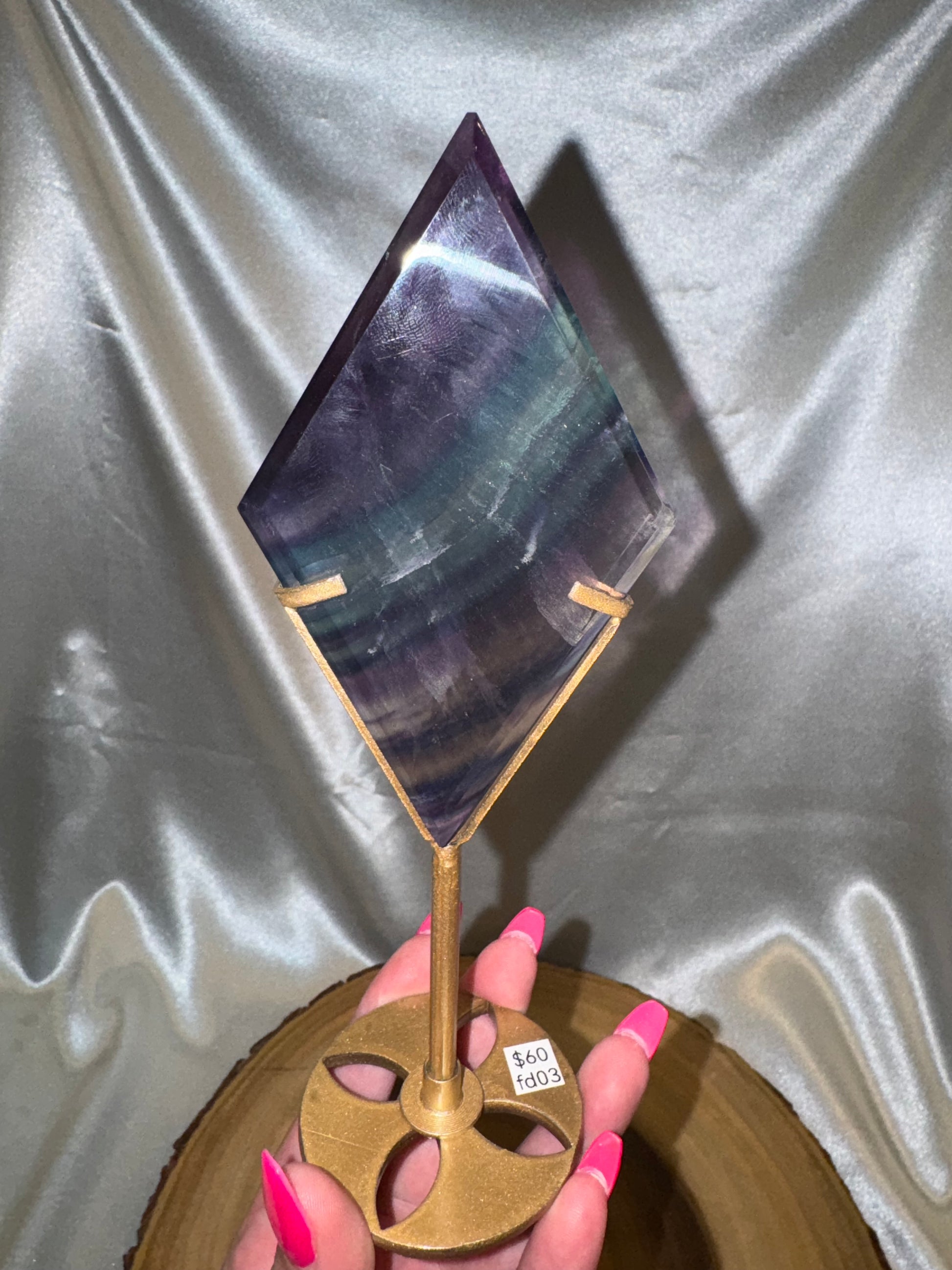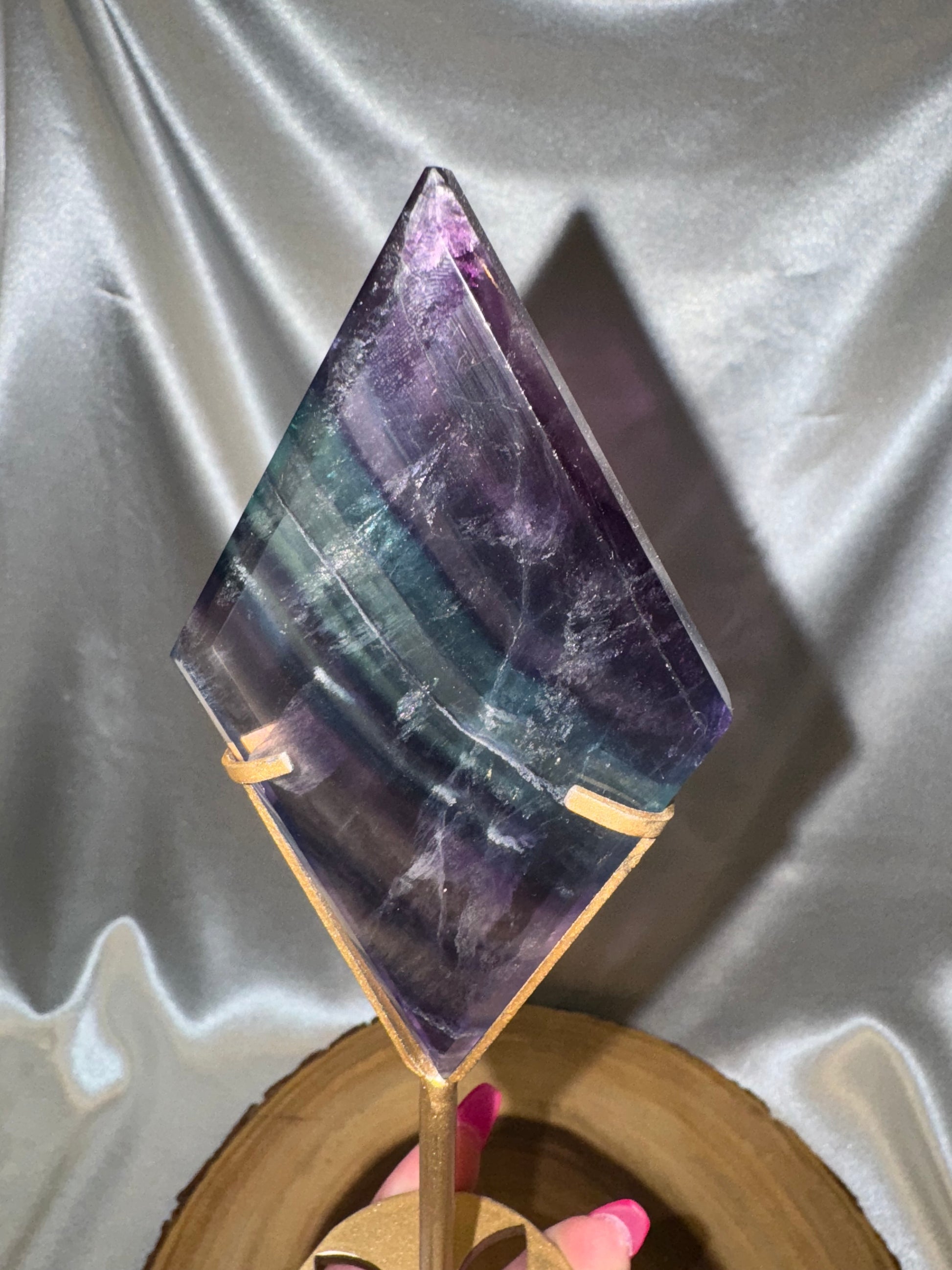 Approximately 8 ounces with stand and 5 ounces without stand. On stand 8 inches tall. Fluorite diamond itself is 4.75 inches by 2.75 inches.