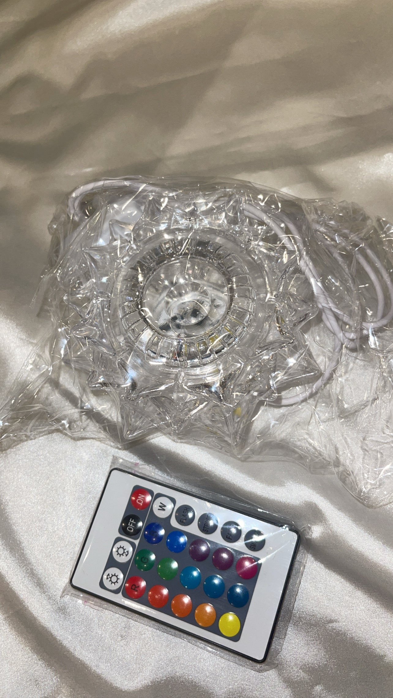 1- remote (remote can change to multiple different colors [red, purple, white, blue, yellow, orange, green, pink] and you can choose to be on a specific color or choose to flash, strobe, or fade to all the colors)