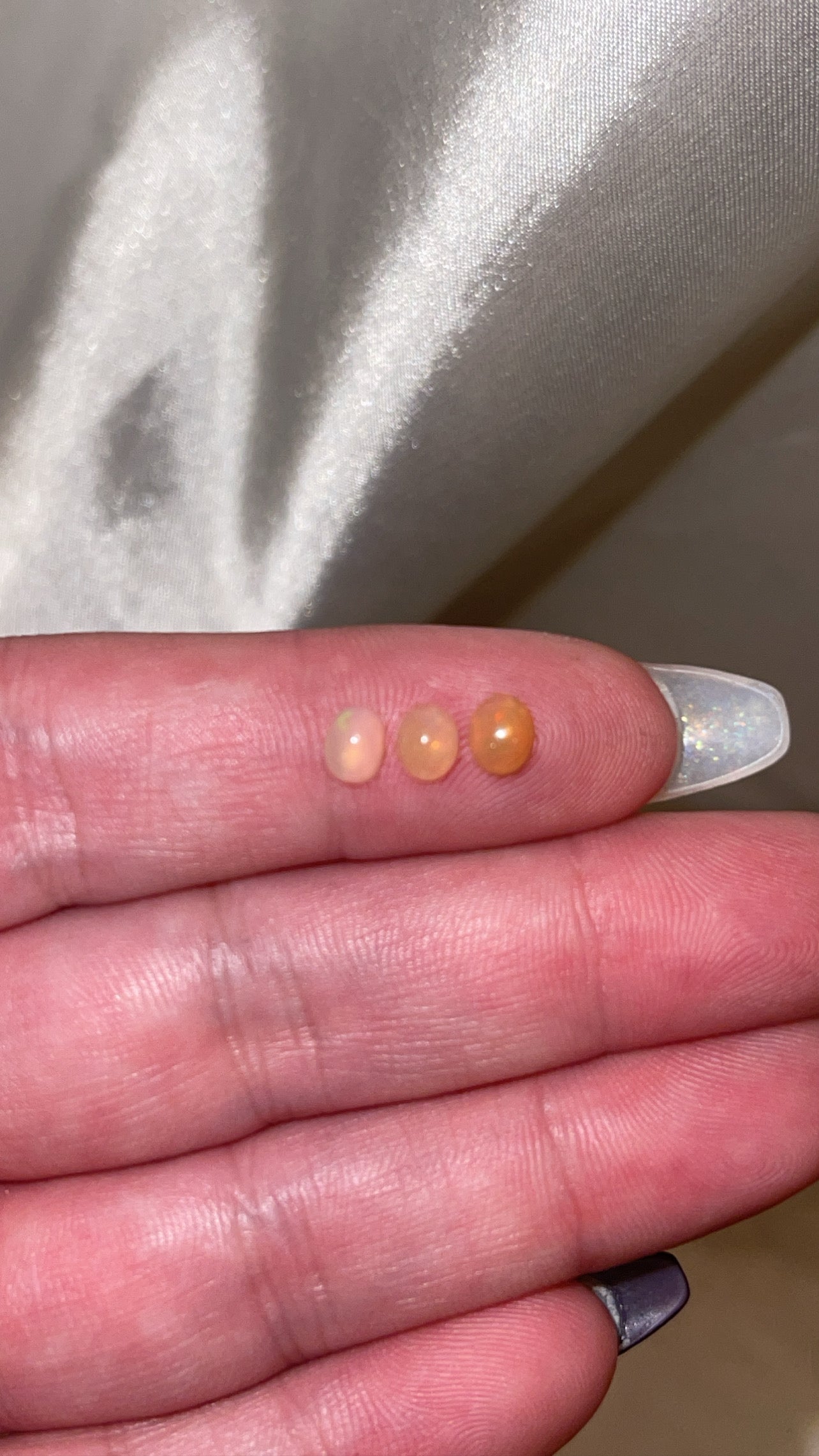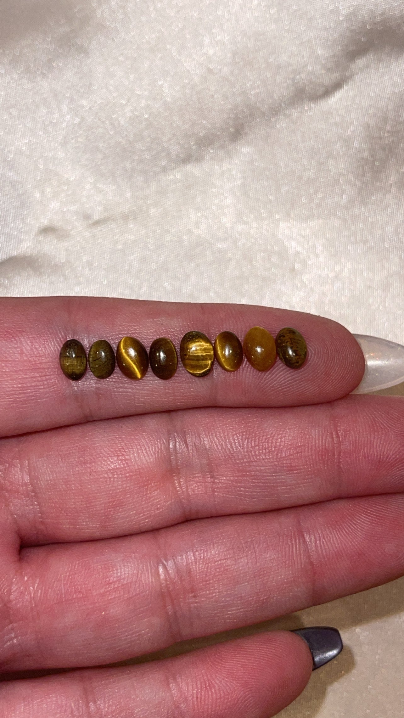 Approximately 2mm x 2mm for lapis lazuli, 4mm x 6 mm for tigers eye, and 3mm x 4mm for opals.