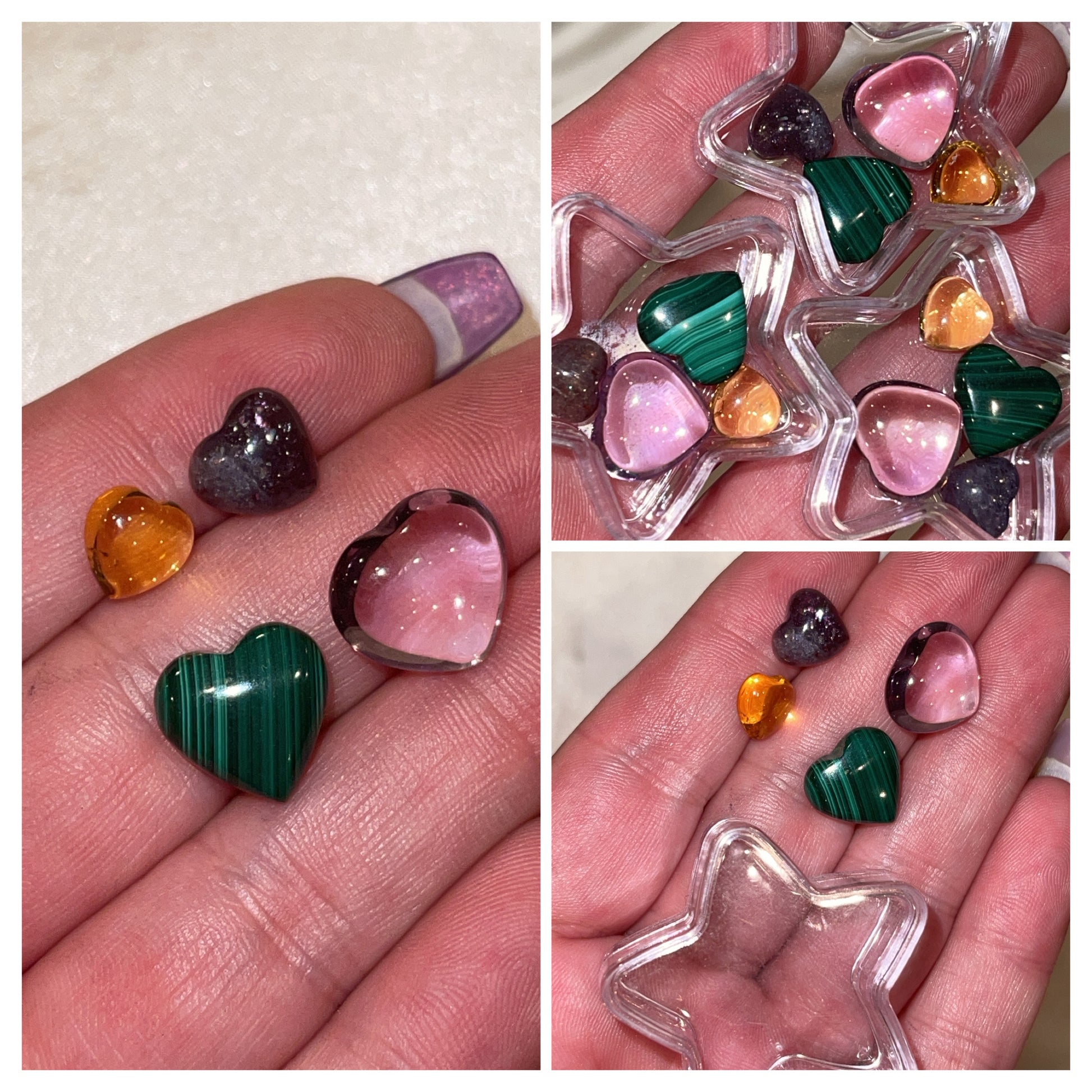 -Heart Crystal Set: comes in a clear acrylic star shaped case. Contains high grade crystal hearts in Malachite, Natural citrine, Cordierite, and Amethyst. Valued at $30 a set!