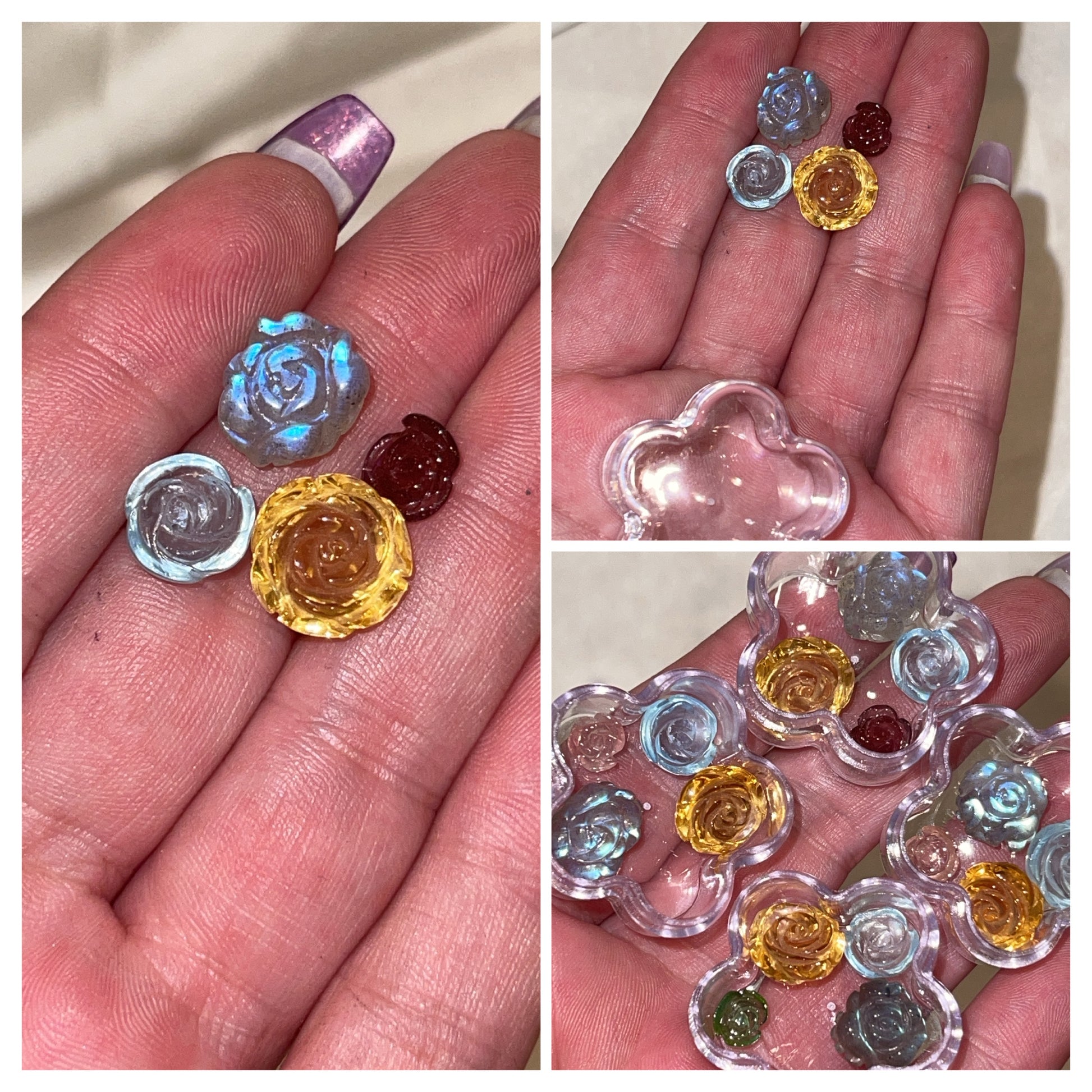 -Flower Crystal Set: comes in a clear acrylic flower shaped case. Contains high grade mini flower carvings in Labradorite, natural citrine, aquamarine, and colored tourmaline (pink or green). Valued at $50 a set!