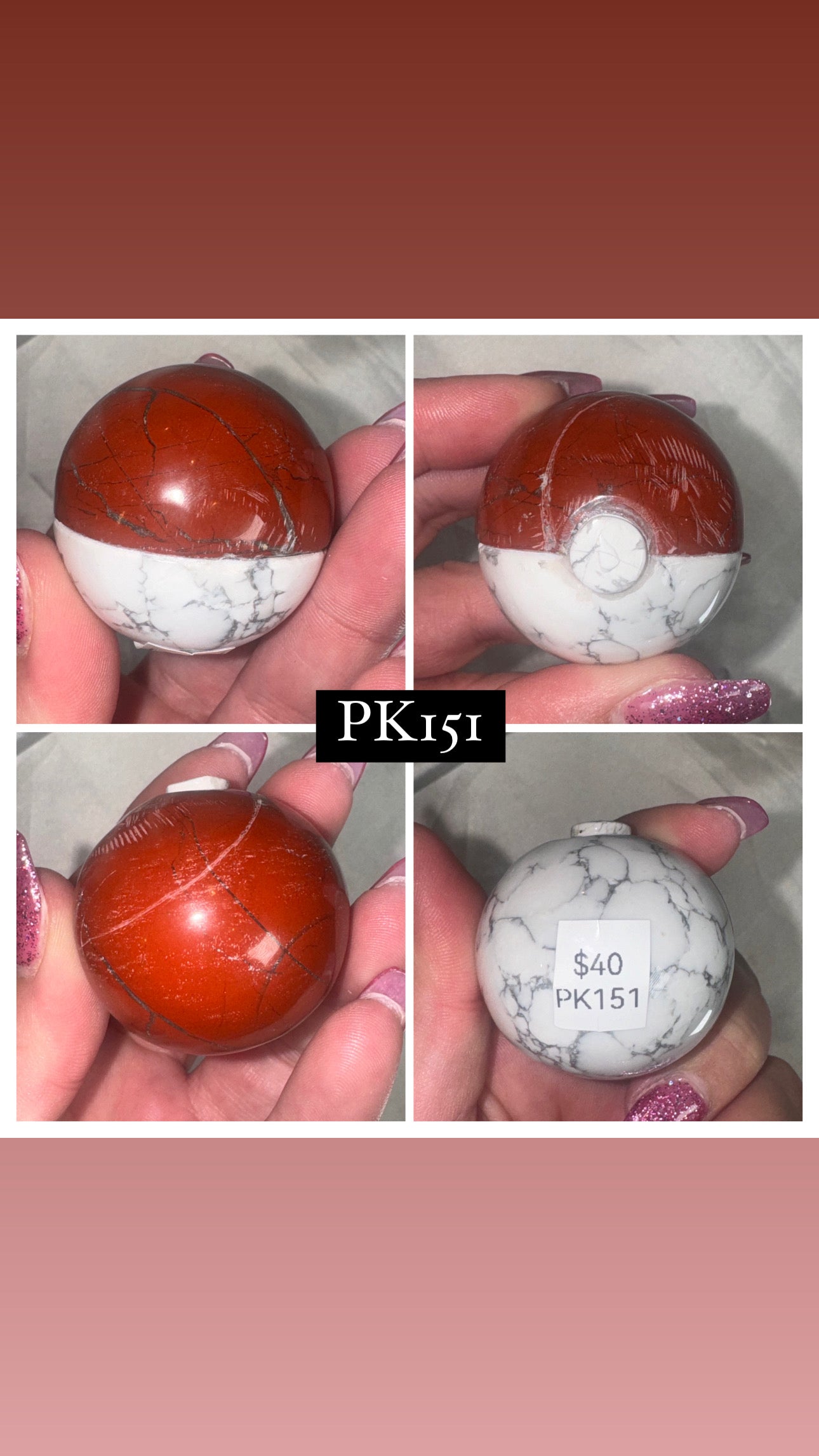 1- Howlite & Red Jasper Pokémon Pokeball (two sizes)