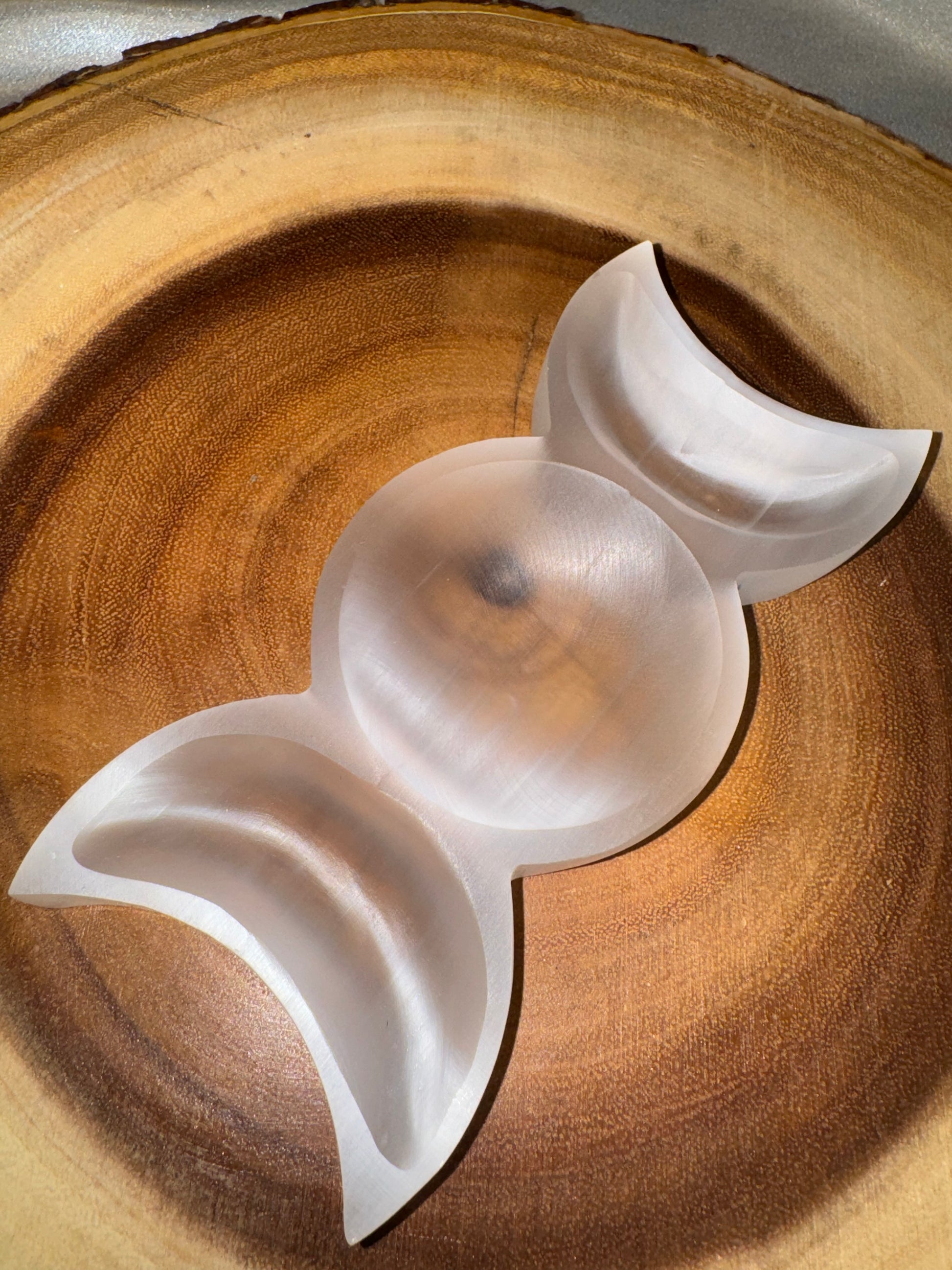 1- satin spar selenite triple moon bowl (choose design)